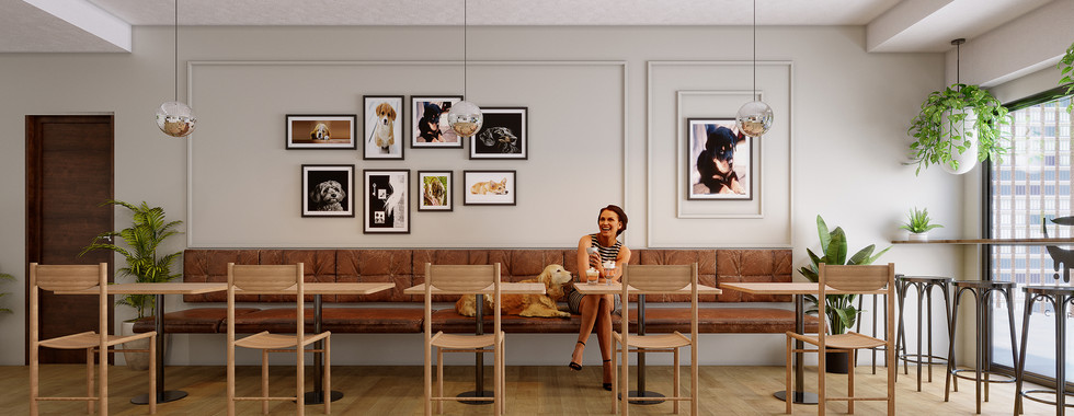 This pet-friendly coffee shop design by Dhaka Designers blends modern elegance with cozy warmth, featuring light wood floors, plush seating, and greenery. With inviting spaces for both pets and people, it’s a perfect spot for enjoying coffee and donuts, highlighted by sleek decor and a welcoming atmosphere.